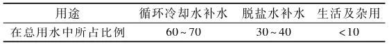 現(xiàn)代煤化工主要通過煤氣化產(chǎn)出合成氣,將合成氣進(jìn)行變換、脫酸等工序后進(jìn)一步合成最終產(chǎn)品。根據(jù)現(xiàn)代煤化工項(xiàng)目用水特點(diǎn),從用水點(diǎn)分析,工藝直接應(yīng)用的新鮮水在總用水量中所占比例較低,新鮮水主要用于補(bǔ)充循環(huán)冷卻水及制取脫鹽水,具體比例見表3。因此,現(xiàn)代煤化工直接產(chǎn)生的含鹽廢水主要包含循環(huán)冷卻水排污水以及脫鹽水排污水。隨著循環(huán)冷卻水用量的增大及濃縮倍數(shù)的增加,廢水經(jīng)過逐級(jí)利用和處理后,最終會(huì)產(chǎn)生大量的濃鹽水,不僅會(huì)抑制微生物的活性,導(dǎo)致廢水處理系統(tǒng)不能正常運(yùn)行,還使得出水tds超標(biāo),污染水環(huán)境。現(xiàn)代煤化工含鹽廢水的處理主要包含低鹽廢水處理、濃鹽水處理以及高濃鹽水處理。