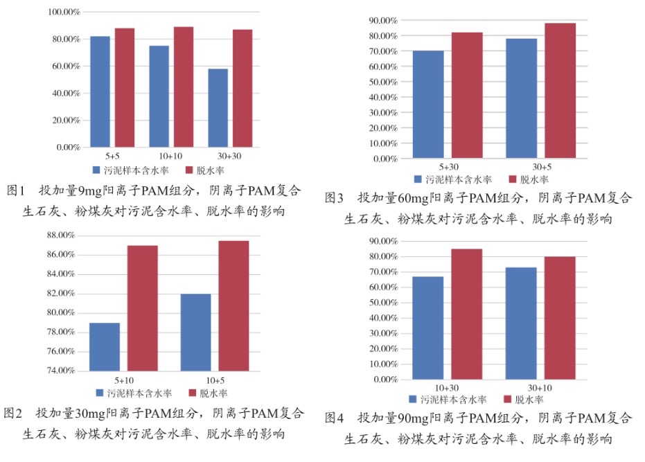 如圖1、圖2、圖3、圖4所示,分別為投加量為9mg、30mg、60mg、90mg的陽離子pam組分,陽離子pam 復(fù)合生石灰、粉煤灰對(duì)污泥含水率、脫水率的影響。